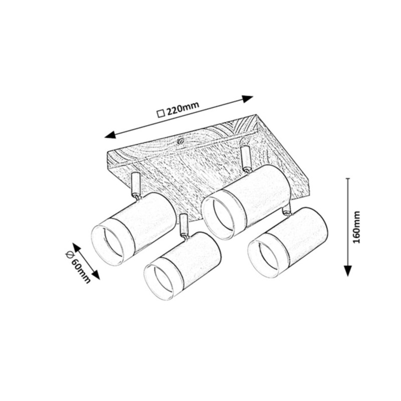 Spotul de tavan cvadruplu Toras, în stil scandinav, este recomandat în special celor care caută un model care să îmbine designul modern cu naturalețea lemnului pentru camera de zi sau dormitorul lor. Lampa este completată de abajururi metalice negre cilindrice și poate fi fixată pe tavan cu ajutorul unei baze decorative mari pătrate, de culoarea stejarului. Datorită capetelor de lampă flexibile, puteți direcționa lumina acestora după preferințe. Toras poate fi folosit cu patru surse de lumină, fiecare cu o putere de până la 5 W, tip soclu GU10. Dacă doriți să folosiți spotul de tavan în dormitor, se recomandă utilizarea surselor de lumină albă caldă pentru a facilita crearea unei atmosfere intime și familiale. Dimensiunile spotului de tavan cvadruplu Toras sunt următoarele: lățimea și înălțimea sunt de asemenea 220 mm, diametru abajur 60 mm, distanța lămpii față de tavan 160 mm. Acest model se livrează fără surse de lumină.