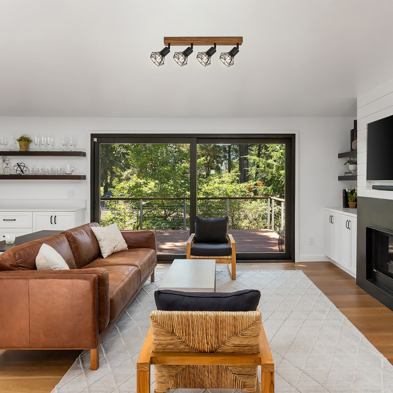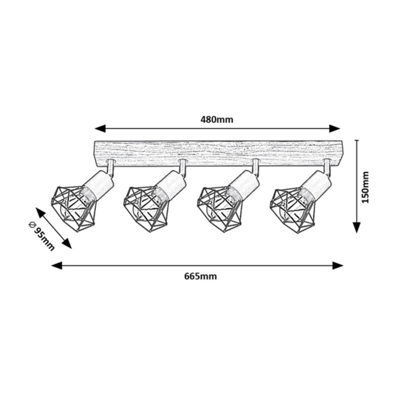 Spotul in stil industrial Zeus cu 4 becuri este recomandat pentru diverse incăperi din apartamentul dvs.: il puteți monta in camera de zi, sufragerie, bucătărie sau chiar dormitor. Lampa este construită din metal și lemn și poate fi montată pe perete cu ajutorul unei baze alungite pătrate, decorative, din stejar. Abajururile cu bare cu formă caracteristică sunt realizate din metal negru mat. Lampa Zeus poate fi folosită cu 4 becuri de maximum 40 W fiecare. Tipul de soclu este E14. in funcție de preferințe și incăperea instalării, puteți alege o sursă de iluminat albă caldă sau naturală. Datorită capetelor flexibile, acest model poate lumina eficient chiar și o incăpere mai mare. Dimensiunile spotului Zeus cu 4 becuri sunt: lățime 665 mm, inălțime 150 mm, adancime 150 mm. Acest model este furnizat fără surse de iluminat.