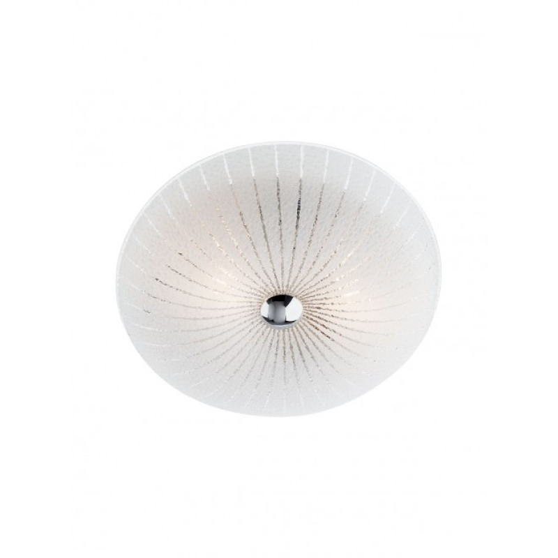 Plafonieră pentru interior, structură din metal vopsit alb, dispersor din sticlă serigrafiată și decorată cu granule din sticlă, cu element de fixare cromat.
