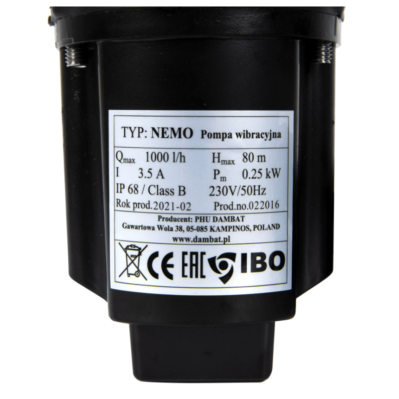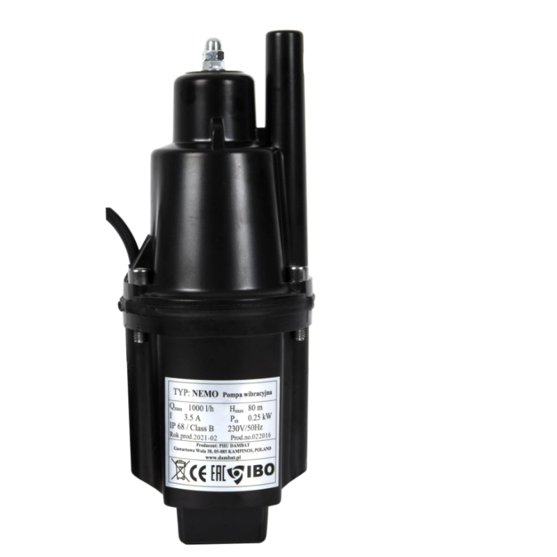 IBO Dambat Polonia este unul dintre cei mai cunoscuti producatori de pompe si hidrofoare, dar in acealsi timp si importator, exportator si distribuitor de pompe ale producatorilor de top din Europa si din lume.Pompe cu membrana pentru stropire cu diametru de 105 mm. Pompa inundabila NEMO este o pompa cu membrana, ideala pentru stropirea cu apa curata datorita eficientei ridicate. In ciuda dimensiunilor mici ale pompei insasi, structura sa, bazata pe electromagneti, permite crearea unei presiuni ridicate, necesara pentru stropire. Pompa cu membrana a castigat o imensa popularitate in randul posesorilor de mici gradini, datorita dimensiunilor compacte, precum si a greutatii reduse. Pompa este echipata cu un cablu de alimentare lung de 10 m. Carcasa pompei este fabricata din aluminiu. Pompa de dimensiuni reduse este ideala chiar si in puturile mici. Diametrul minim al unui put forat in care poate functiona pompa, este de 120 mm.