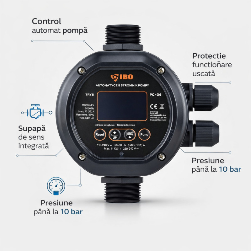Comutatorul electronic de presiune PC-34 este un controler digital pentru pompe, proiectat pentru pornirea si oprirea automata a pompei in functie de presiunea apei si de debitul din instalatie.