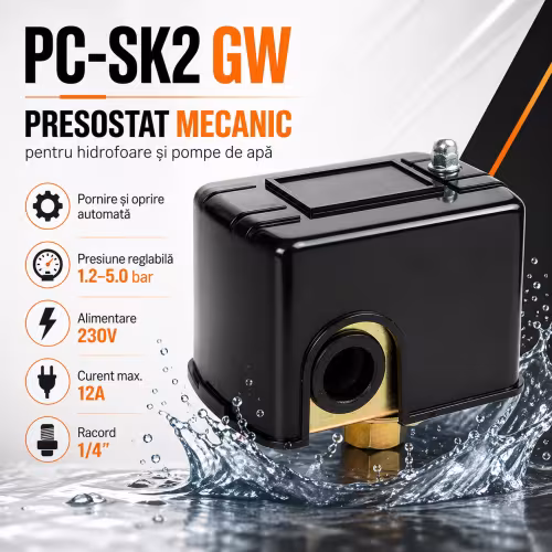 IBO PC-SK2 GW este un presostat mecanic destinat pornirii și opririi automate a pompelor utilizate în sisteme de hidrofor, instalații de alimentare cu apă și aplicații rezidențiale. Dispozitivul controlează funcționarea pompei în funcție de presiunea setată pentru pornire și oprire.