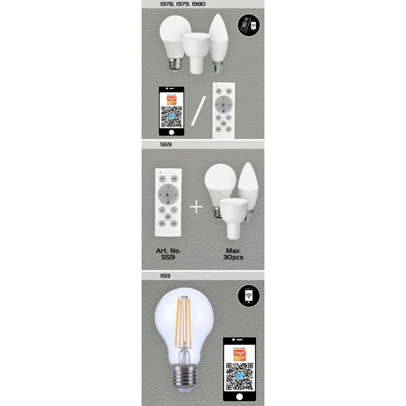 Datorită multitudinii de funcții suplimentare, becul inteligent LED Smart WiFi cu numărul de articol 1980 este o alegere excelentă pentru lămpile montate in camera de zi sau dormitor. Această sursă de iluminat albă este realizată din plastic și aluminiu cu forma C37, putere 5 W, flux luminos de 480 lumeni, iar temperatura culorii poate fi reglată intre 3.000 - 6.500 K, in funcție de preferințe. Acest lucru inseamnă că becul Smart WiFi poate radia o lumină caldă, naturală, sau rece, albă. Atat temperatura de culoare și luminozitatea pot fi reglate cu ajutorul unei telecomenzi sau a aplicației WiFi. O telecomandă poate fi achiziționată separat pentru această sursă de iluminat inteligentă. Becul poate emite și lumină RGB, are o durată de viață de 25.000 de ore și tip de soclu E14. Diametrul acestei surse de iluminat Smart WiFi este de 37 mm, inălțimea 110 mm. Pentru acest bec inteligent, oferim o garanție de 3 ani.