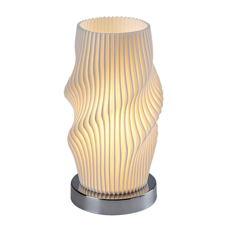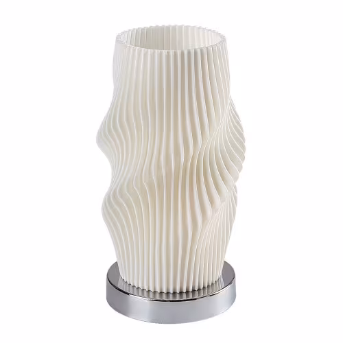 Lampa de masă Tiana, în stil modern, poate fi amplasată în camera de zi sau în dormitor, pe orice masă sau noptieră. Modelul cromat realizat din metal este completat de un abajur din plastic alb, iar lampa stă pe o bază decorativă rotundă mică. Suprafața ondulată a modelului Tiana cu întrerupător cu cablu conferă acestei lămpi de masă un aspect organic. Modelul mic poate fi folosit cu o singură sursă de lumină cu o putere de până la 25 W, tip soclu E14. Puteți alege temperatura de culoare a sursei de lumină pe care doriți să o folosiți în funcție de gustul dumneavoastră: dacă lampa este amplasată în dormitor, merită să folosiți un bec cu lumină albă caldă, deoarece acest tip de lumină ajută la crearea unei atmosfere confortabile și primitoare, este relaxant pentru ochi și ideal pentru deconectare. Dimensiunile lămpii de masă Tiana sunt următoarele: înălțime 210 mm, diametru 110 mm, diametrul bazei decorative 100 mm, lungimea cablului 1500 mm. Acest model se livrează fără sursă de lumină.